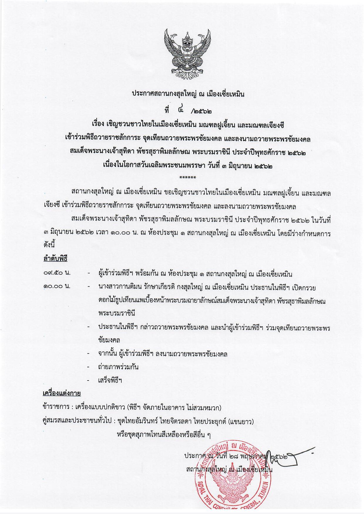เชิญชวนชาวไทยในเมืองเซี่ยเหมิน มณฑลฝูเจี้ยนและมณฑลเจียงซี เข้าร่วมพิธีถวายราชักการะ จุดเทียนถวายพระพรชัยมงคล และลงนามถวายพระพรชัยมงคล สมเด็จพระนางเจ้าสุทิดา พัชรสุธาพิมลลักษณ พระบรมราชินี เนื่องในโอกาสวันเฉลิมพระชนมพรรษา วันที่ ๓ มิถุนายน ๒๕๖๒
