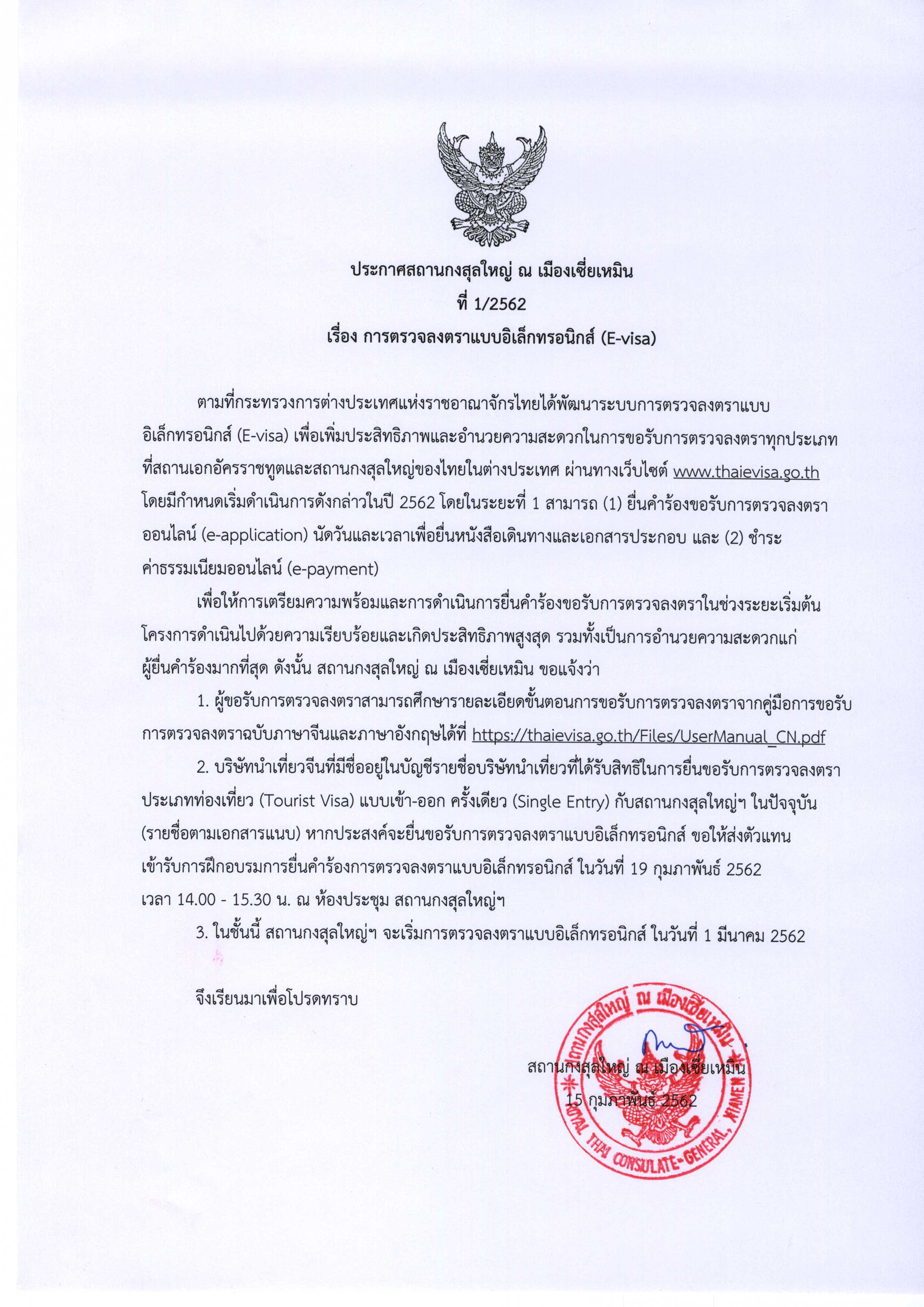 ประกาศสถานกงสุลใหญ่ ณ เมืองเซี่ยเหมิน เรื่อง การตรวจลงตราแบบอิเล็กทรอนิกส์ (E-Visa)
